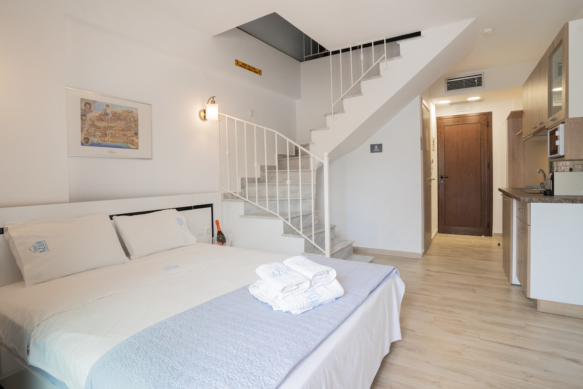 The Superior Double Studio on the 2nd floor offers a bright and cozy space ideal for couples. It features a comfortable double bed, a fully equipped kitchenette, a modern bathroom, and a private balcony with sea view. Enjoy A/C, free Wi-Fi, Smart TV, and easy access to the beach and promenade—perfect for a relaxing seaside getaway.