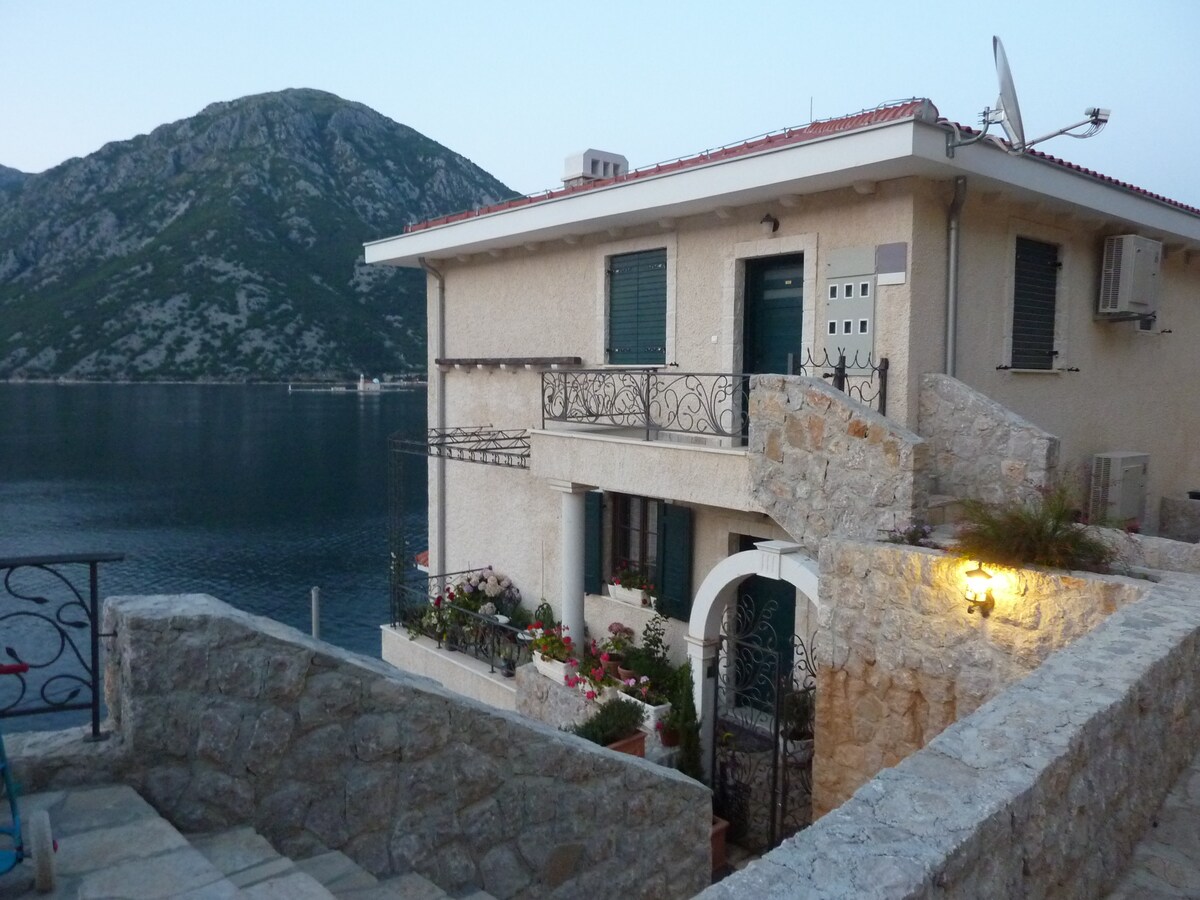 This is a lovely 2 bedroom apartment condo in a over 200 years old 19th Century stone house quiet and peaceful area, with a Stunning and Most Beautiful view . House has been renovated and equipped with the new furniture and appliances for enjoyment. The most beautiful sunset in the Kotor bay right from your bedroom or living room. Full kitchen with a refrigerator, stove top and oven. HDTV, and WIFI. Small stone beach in front of the house..