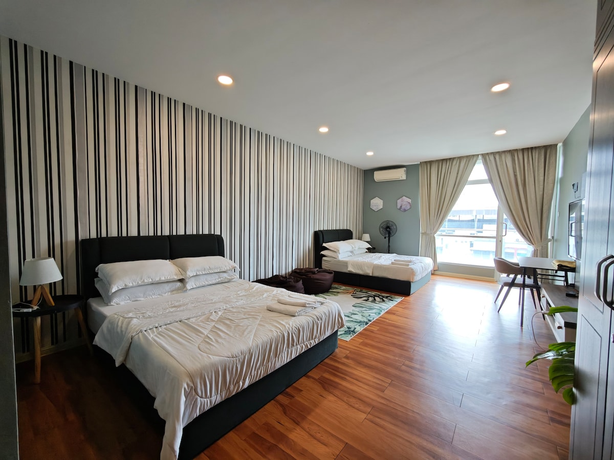 Modern, spacious studio suite at Plaza Bangi Perdana (Level 3) – ideal for families, business travellers & UKM visitors. 2 comfy queen beds, kitchenette, workspace, balcony & fast WiFi. Just steps to shops, cafes & 7-Eleven, and right beside Hospital An-Nur Bangi. Minutes to UKM, GMI, Bangi Gateway & EVO Mall. Easy access to PLUS & Kajang. Relax, work & explore Bangi with ease!