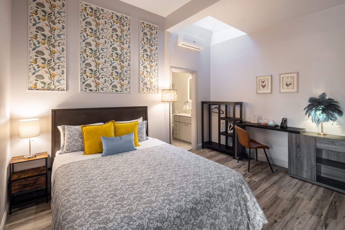 Halaman kami Queen Ensuite berjarak beberapa langkah ke teras luar ruangan dan menampilkan tempat tidur queen dengan kamar mandi pribadi. Kamar yang indah ini menawarkan ruang untuk bersantai dengan pencahayaan alami dari pintu berpanel kaca. Perabotan tambahan meliputi stasiun kerja, lemari pakaian, TV pintar, kulkas mini, pembuat kopi, setrika, hairdryer, seprai dan handuk. Akomodasi ini cocok untuk petualang yang mencari tempat yang nyaman untuk bersantai setelah seharian menjelajahi kota.