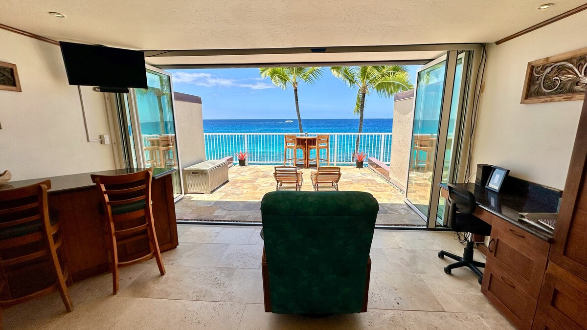 🌊Lantai atas tepi laut langsung, kondominium dua kamar tidur yang berada di pusat Kailua-Kona, Hawaii. Masuklah untuk menikmati pemandangan laut yang menakjubkan dari jendela dari lantai ke langit-langit dan balkon tepi laut pribadi Anda — selamat datang di surga! 🌴 🌬AC di semua ruang, akses lift (nol langkah!), diperbarui sepenuhnya dengan perabotan berkualitas tinggi di seluruh ruangan. Dari balkon, saksikan penyu laut di kolam pasang surut di bawah, temukan lumba-lumba di lepas pantai, dan nikmati matahari terbenam yang spektakuler — semuanya hanya beberapa langkah dari laut.