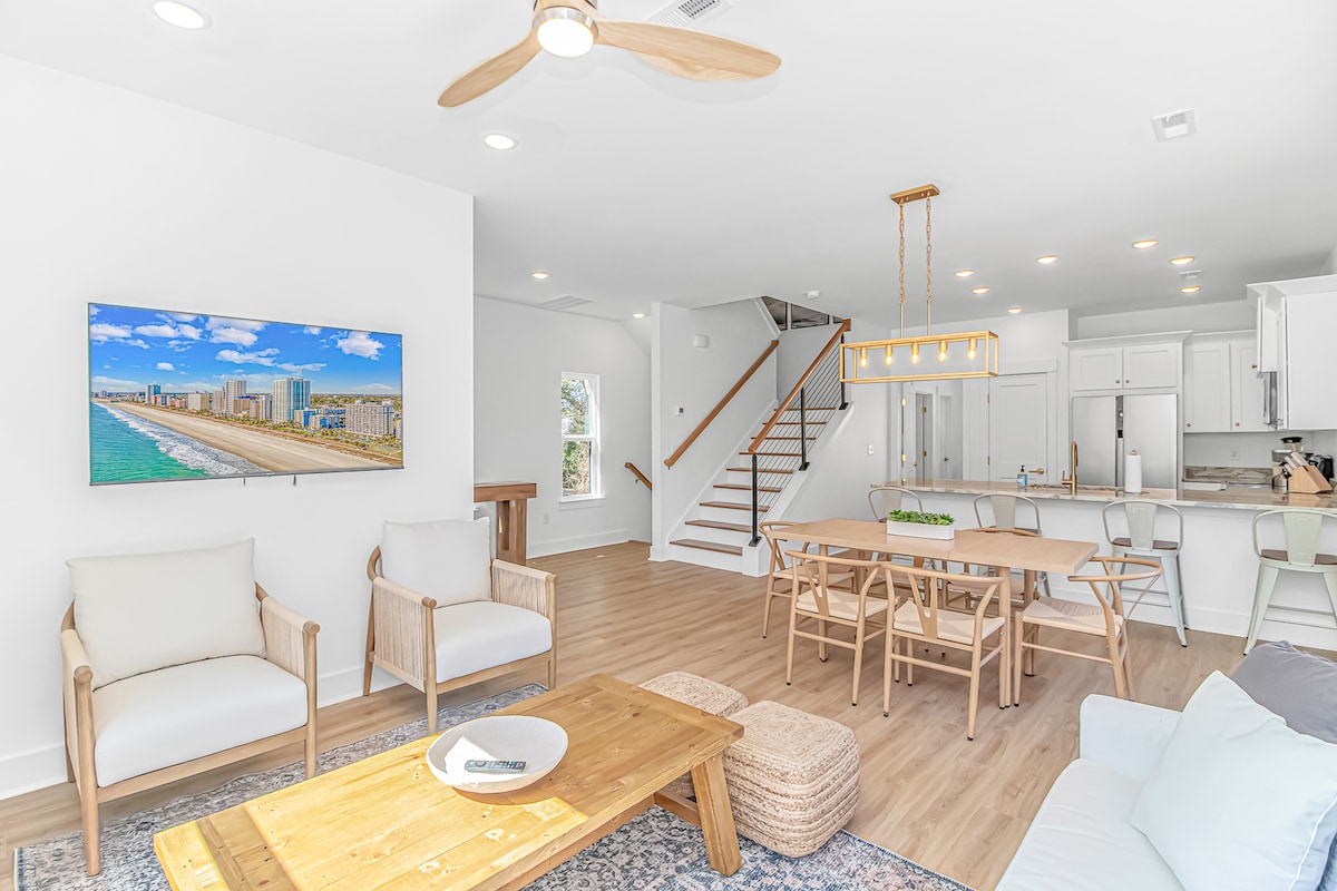 Par for the Shore is a modern 4-bedroom coastal home in North Myrtle Beach — where golf retreats and family beach vacations both come to win. New construction. Private heated pool. Included golf cart. Game room with air hockey table and neon glow. PS5 in the living room. Five minutes from the sand on foot, and minutes from some of the best courses on the Grand Strand. This isn't just a place to sleep between rounds and beach days — it's the home base your group will keep coming back to.