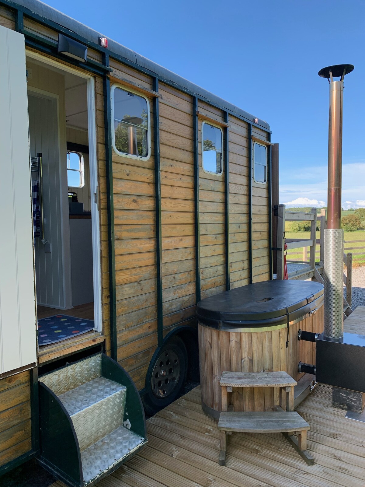 Gerobak barang kereta api kami ( Wally's Wagon ) menawarkan akomodasi terinspirasi kereta api untuk pasangan , telah dirancang dengan cermat untuk menjadi ruang kamar tidur yang dipesan lebih dahulu, dan memiliki kamar mandi dan toilet ensuite. Tempat ini unik dan akrab, dihias dengan indah, dan ideal untuk liburan di pedesaan. Tempat ini memiliki tempat tidur ganda ukuran penuh, dan dipanaskan oleh pembakar kayu kecil. Kereta berdiri di area tamannya sendiri, menghadap ke tanah paddock. Tempat ini memiliki bak mandi air panas pribadi dan perapian luar dan BBQ