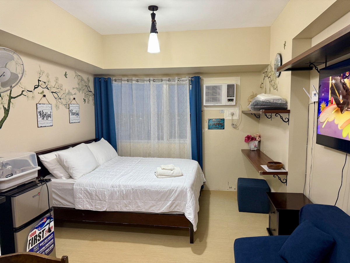 Unit kondominium ini berjarak berjalan kaki ke restoran, toko, rumah sakit, dan Ayala Mall. Sekitarnya aman. Ada petugas keamanan 24 jam dan staf yang ditugaskan di lobi. Terdapat lift di gedung ini. Interior unit studio hangat dan nyaman. Tempat ini dilengkapi dengan 2 tempat tidur double. Tempat ini bisa menerima hingga 3 tamu. WIFI internet disediakan - ideal untuk panggilan internet dan berselancar web.