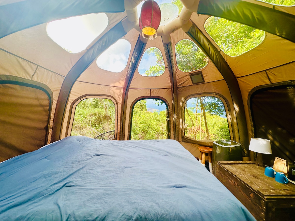 Mango is an intimate, nature-forward glamping hideaway surrounded by mango trees and ocean views. With 360° windows and a skylight, the space is bathed in natural light and connected to the outdoors at all times. Guests enjoy a queen bed, outdoor seating, boho-style amenities, and access to Casita OrquĂdeaâs serene communal spacesâperfect for slowing down and recharging.