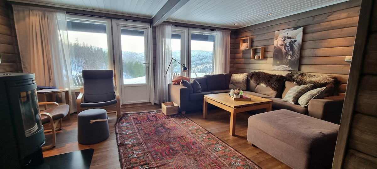 Kabin yang luas dan bagus dengan sauna, 5 kamar tidur, 2 lantai, 2 ruang tamu, dan 2 kamar mandi dengan pancuran. Lokasi yang cerah dengan teras dan pemandangan indah. 50 m ke jalur ski lintas alam yang tertata dan sekitar 2 km ke pusat ski dan alpine Bortelid dan toko. Internet. Anjing diperbolehkan