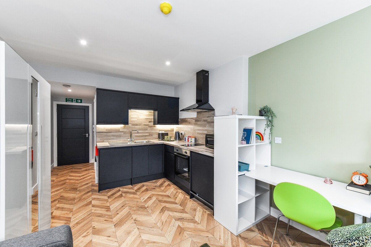 Studio modern di pusat kota Nottingham di bagian belakang gedung sehingga lebih tenang. Hanya 100 m dari Victoria Centre dan Market Square. Double bed dan ensuite, juga dilengkapi dengan dapur dengan spesifikasi tinggi termasuk kompor AEG, mesin cuci / pengering, kulkas dan microwave panggangan. Tempat ini memiliki internet wifi cepat, sofa kecil, TV Samsung 40"pintar 4k terpasang TV, meja bar dengan bangku bar kulit. Check - in mandiri fleksibel dari brankas kunci di pintu masuk utama.
