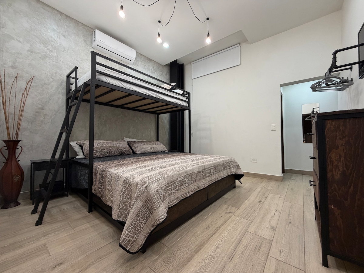 Nikmati depa yang nyaman di pusat Monterrey, sangat cocok untuk liburan romantis, perjalanan bisnis, atau untuk menjelajahi kota dengan nyaman dan bergaya. Tempat ini memiliki 1 kamar tidur dan sofa bed, jacuzzi pribadi, teras dengan barbekyu yang ideal untuk bersantap di luar ruangan, dapur lengkap dan ruang makan fungsional, Wi-Fi cepat, TV, AC, dan pemanas. Hanya 2 menit dari Av. Madero dan V. Carranza dan 12 menit dari San Pedro Garza GarcĆa.