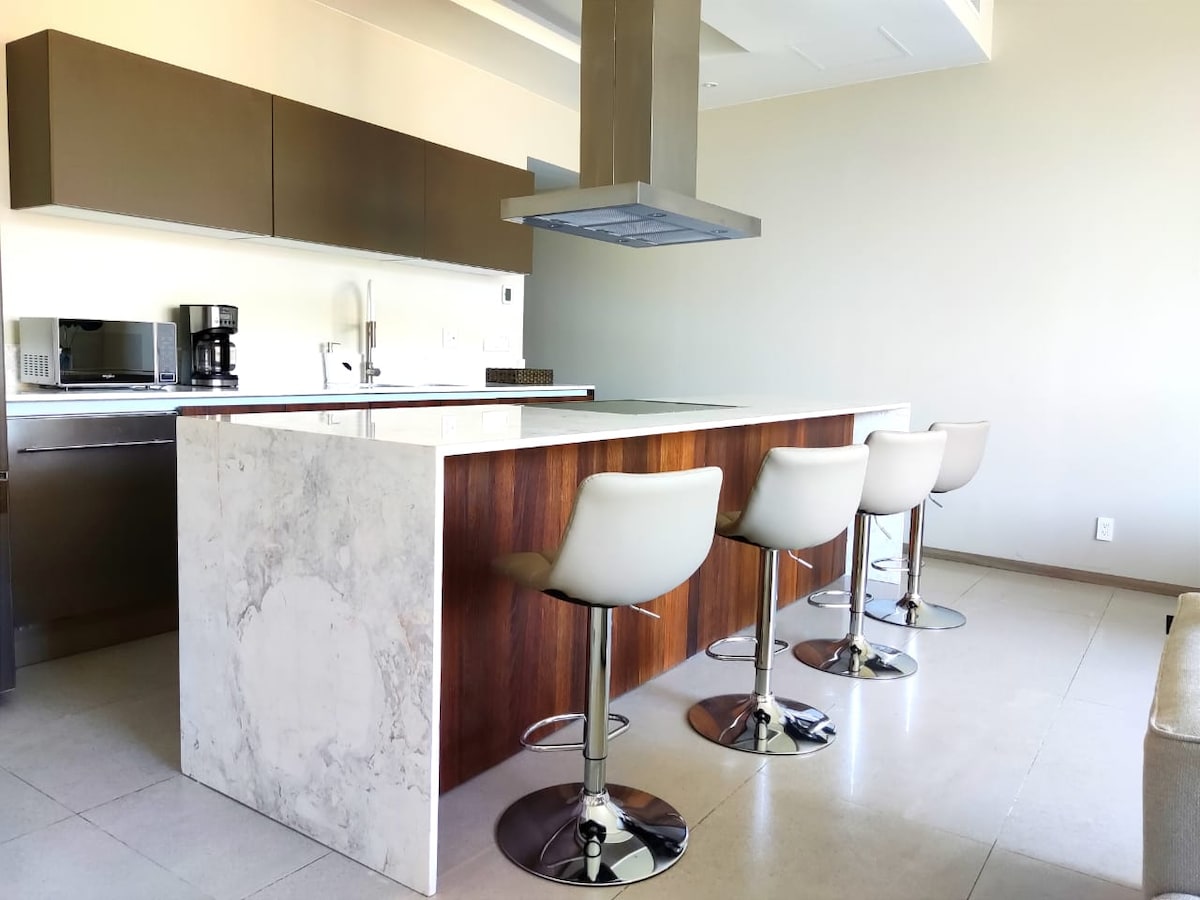 Apartemen 55 m2 yang luar biasa, lengkap (Pemanggang listrik, Oven, Mikro, pembuat kopi, blender, pemanggang roti, mesin cuci piring) dan AC sentral. Ideal dan super nyaman untuk 4 orang di Maritima Golf, lokasi luar biasa di Fracc. Flamingo, dengan pemandangan laut dan lapangan golf yang spektakuler. TIDAK RAMAH HEWAN PELIHARAAN 🚫 Kami memiliki akses pantai pribadi dengan kamar mandi, pancuran. 2 Albercas di PB dan Roof Top dengan pemandangan teluk dan lapangan golf yang spektakuler. Gym yang sangat lengkap.