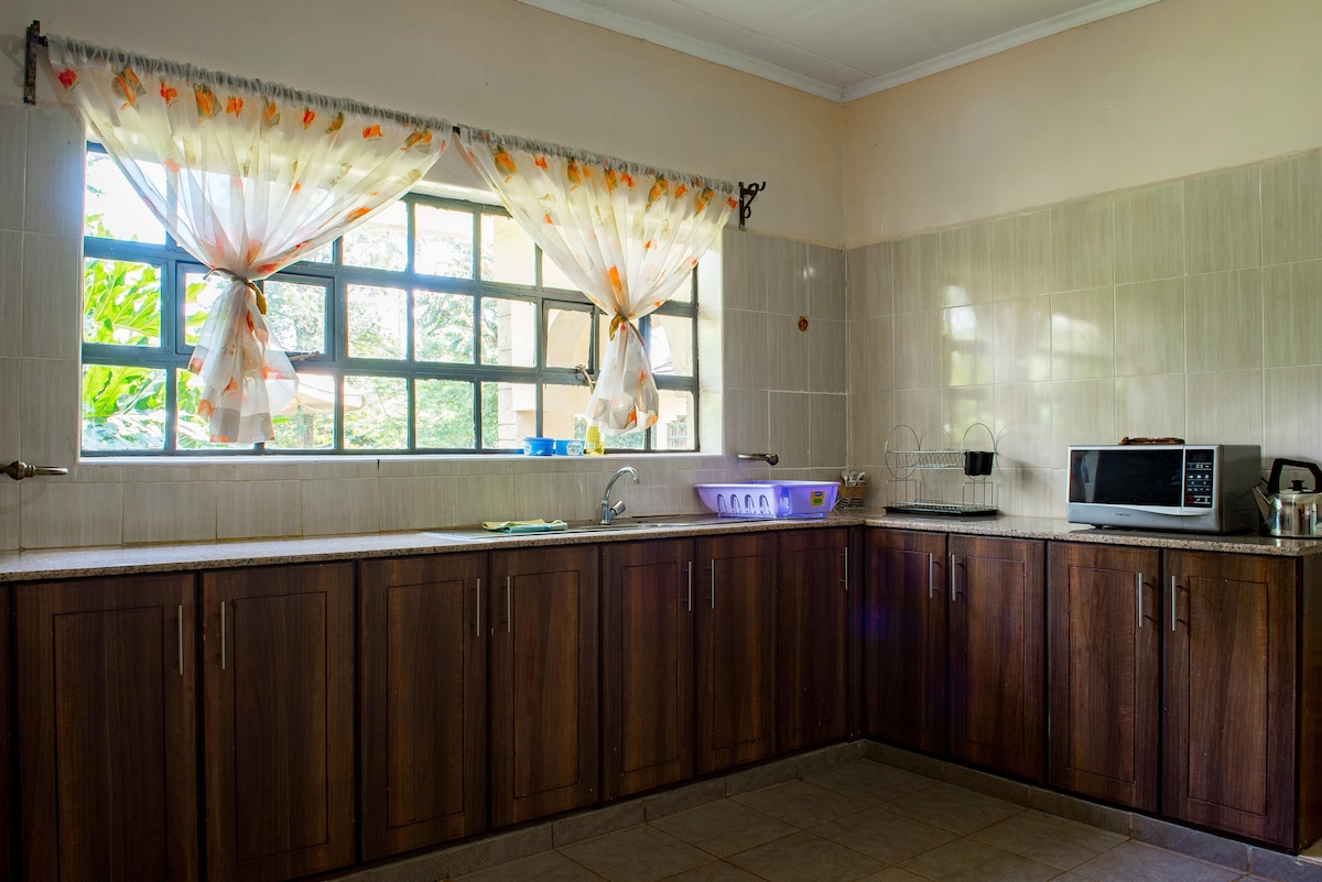 Rumah ini terletak di antara Gunung Kenya dan Aberdares di lokasi pedesaan di peternakan campuran. Semua kamar tidur adalah en suite dengan tempat tidur ganda; ruang duduk dan ruang makan luas dan dilengkapi perapian yang nyaman; dapur luas dan lengkap; bar luar ruangan/area duduk dilengkapi meja biliar. Juga tersedia tempat perkemahan/piknik untuk 30 orang dan tempat pernikahan untuk hingga 700 orang.