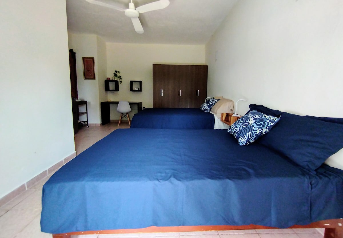 Akomodasi ini memiliki tiga kamar tidur yang bersih, luas, dan nyaman, masing-masing dilengkapi kamar mandi pribadi dan ruang ganti, dan merupakan bagian dari rumah utama. Tempat ini memiliki ruang tamu kecil dan dapur kecil yang terbuka di luar. Area umum yang luas, kolam renang, dan tempat parkir tersedia. Ideal untuk keluarga. Kami berlokasi di Santa María del Tule, lokasi ideal untuk menjelajahi Oaxaca (Ciclo Via, Ruta del Mezcal, dan Tlacolula Valley), 20 menit dari pusat kota.