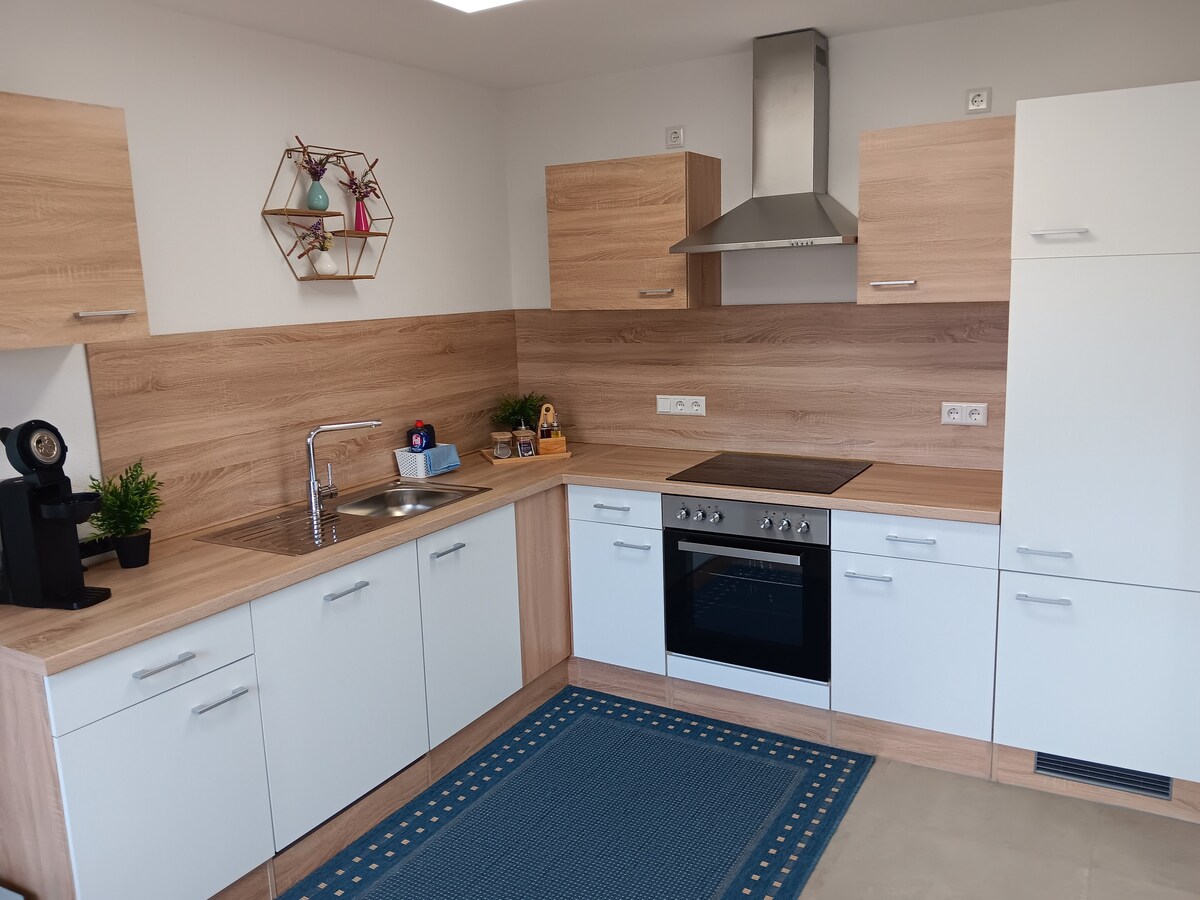 Apartemen yang berlokasi di pusat kota dan modern. 3 menit berjalan kaki ke stasiun kereta api, 5 menit berjalan kaki ke ZEISS. Semua toko yang melayani kebutuhan sehari - hari (kebutuhan sehari - hari, apotek, restoran, bank, camilan, toko roti, dll.) berada dalam jarak berjalan kaki beberapa menit. Dapur kecil built - in termasuk kompor induksi, microwave dengan fungsi pemanggang dan kulkas besar juga menawarkan kemungkinan katering mandiri. Kulkas memiliki kompartemen freezer kecil untuk menyimpan makanan beku.