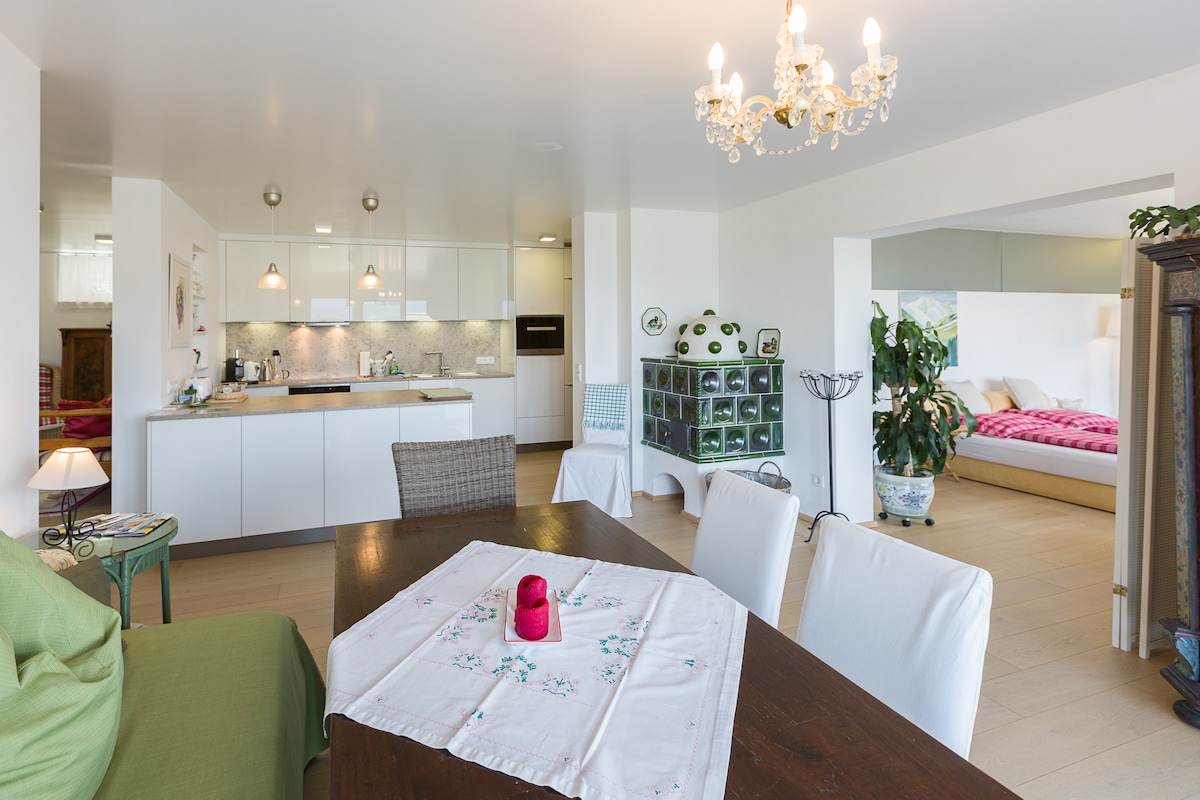 Loteng bergaya dan berperabot nyaman di jantung kota tua. Lantai kayu ek yang indah dan pemanas bawah lantai modern memastikan iklim dalam ruangan yang indah. Dengan bak mandi yang berdiri sendiri dan kompor bioetanol atmosfer (di perapian terbuka), apartemen ini menawarkan banyak kesempatan untuk bersantai. Maisonette ini menghadap ke timur dan barat dan menawarkan cahaya atmosfer kapan pun di siang atau malam hari. Ayunan di jantung apartemen memastikan kegembiraan dan kesejahteraan.