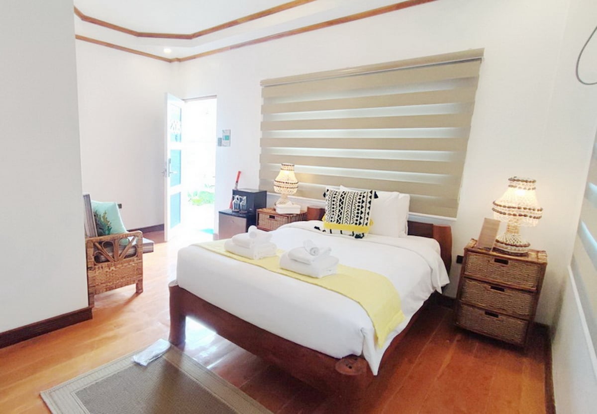 Simple and clean air-conditioned room perfect for couples or small groups. Features 1 queen and 1 single bed, private bathroom, and free access to our beachfront resort. Great for divers and budget travelers looking for a peaceful stay in Anilao. This space includes access to scuba diving activities (PADI/SSI certification, Intro dives, Fun dives), In-Room massage, and Fullboard meals featuring Korean-Filipino comfort food with homemade Kimchi.