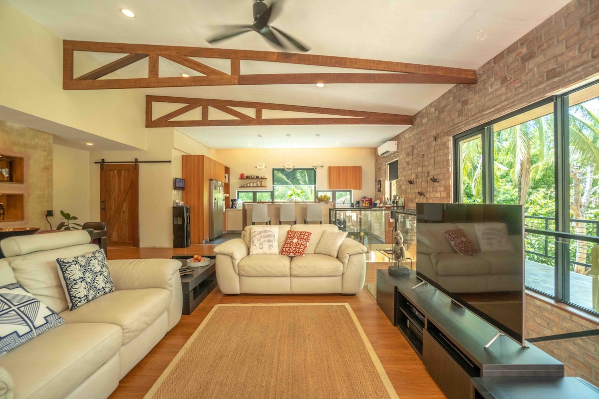 The main house of Honu House is only available at certain times when the owners are traveling. It has two bedrooms which are identical master bedrooms. They are spacious and come with a toilet, two sinks each and a walk-in shower. On the main floor there is a large living and dining area and a full kitchen. As seen in the photos the front of the house has 2.5 stories of glass covered by a real "Koogan" grass roof. If offers a spectacular view of our coconut trees and the jungle beyond.