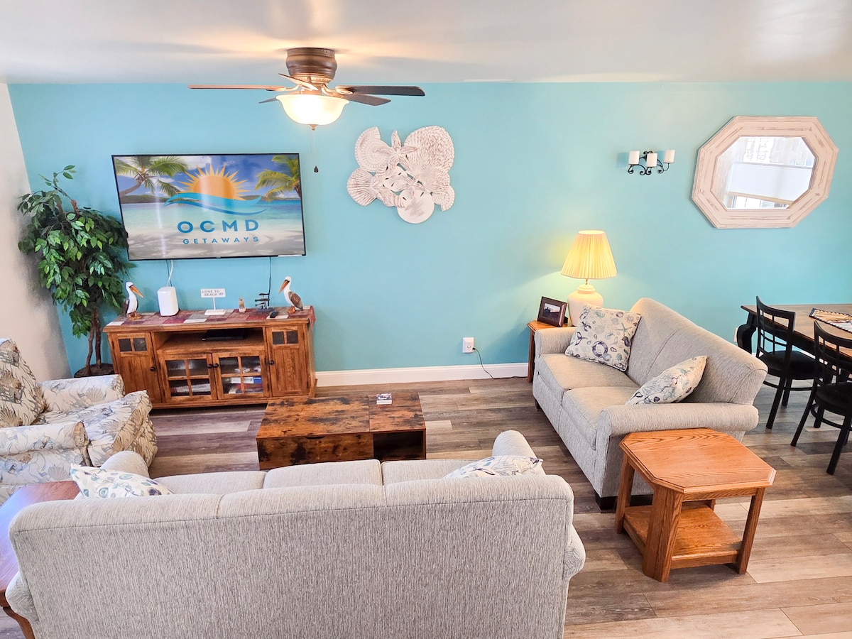 Here's why you'll love it here: 🌊 Perfect Location: 5-minute walk to the beach & Boardwalk. 🛌 Comfort: 2 Full Bathrooms & Smart TVs in every room. 🌅 Sunset Views: A quick 1 minute walk to the bay for beautiful sunsets 🚗 Easy Parking: 2 dedicated spots (rare in OCMD!). Modern 2BR/2BA Ocean City condo. Located perfectly between the ocean & bay, just a short walk to the Boardwalk and beach. Sleeps 6 comfortably with a full kitchen, Smart TVs, and dedicated parking.