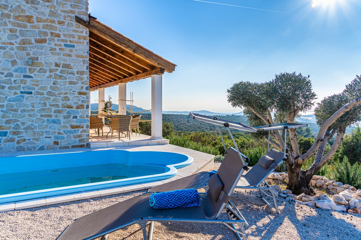 Bangunlah untuk menikmati pemandangan Adriatik yang indah di rumah yang tenang di atas Primošten. Setiap kamar menghadap ke laut, dan empat kamar tidur di lantai atas terbuka ke teras pribadi yang luas untuk pagi hari yang santai di luar ruangan. Kolam renang air asin dikelilingi alam, cocok untuk berenang santai, sementara area tamu terbuka mengalir dengan mudah ke taman. Nikmati makanan di dapur luar ruangan beratap atau beristirahat di lounge teduh – tempat yang tenang untuk keluarga atau teman, hanya berjarak singkat dari pantai.