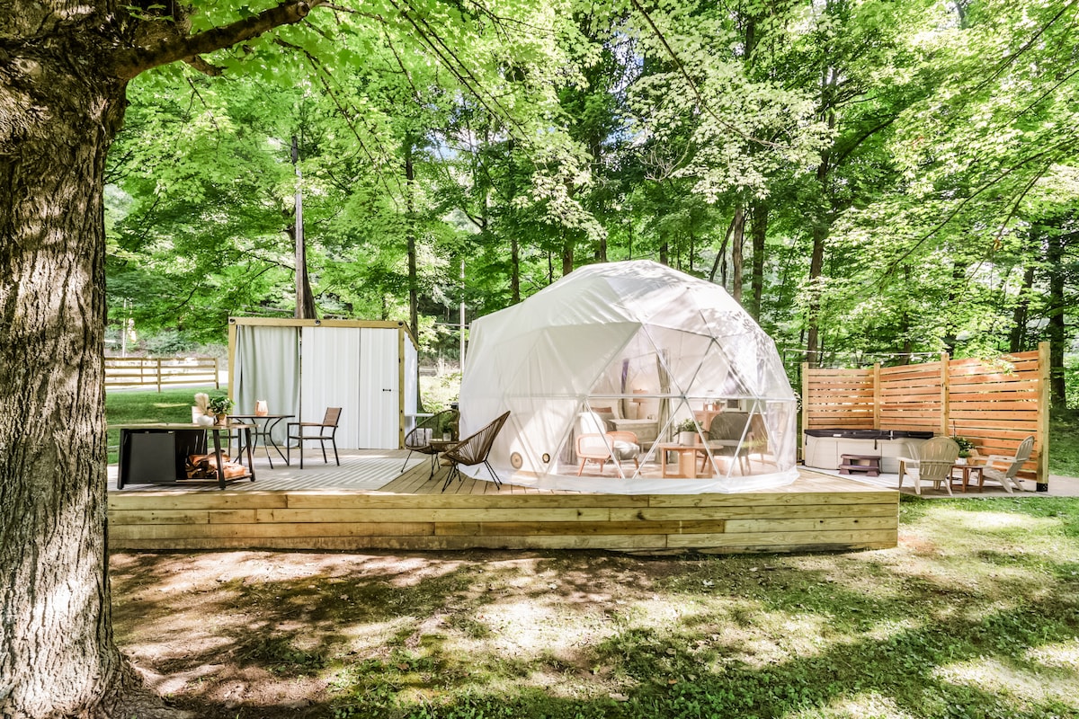 Stargazer Glamping Dome adalah liburan sempurna untuk merasakan alam dengan semua fasilitas mewah. - Stargazer skylight top - Pemanas & AC terbuka sepanjang tahun - Terletak di 7 hektar terpencil - Akses langsung ke Sungai Mohican - Bak mandi air panas pribadi - Patio berperabot lengkap dengan perapian - Dapur kecil berfasilitas lengkap - Proyektor dengan Roku untuk streaming - Starlink WIFI - Kamar mandi mewah - Pemandangan indah hutan dan sungai - Area parkir beraspal - 1,6 mil.dari Bridge of Dreams/Mohican Valley Trail