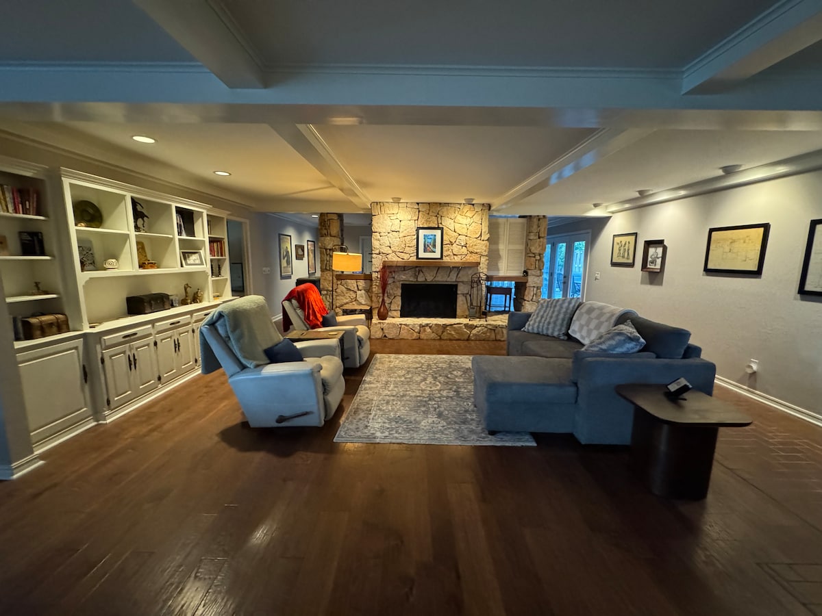 Treadwell Three Pines Corner House is our 1963, 3 BDRM, 2,800 sq. ft. home in OKC. There is plenty of room for humans and any pups to spread out with two living areas, indoor and outdoor dining areas in a fully-fenced backyard. The back living room offers a cozy couch, a 75in TV, an office space, and a wall of windows leading to the back patio and outdoor living space. We're centrally located with easy access to the highway.