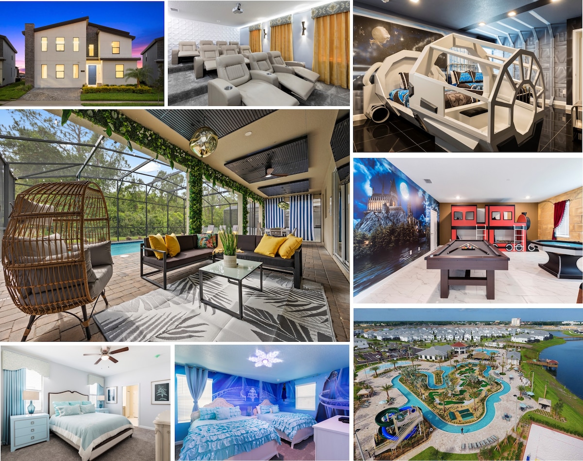 "Hanya 3 mil dari Disney hingga 16 tamu! Bersantai di kolam renang & jacuzzi. Bioskop pribadi mutakhir, menampilkan layar 150 inci, proyektor 4K, dan suara surround imersif. Hidupkan kembali momen film favorit Anda yang belum pernah ada sebelumnya! Streaming di Roku, bermain di PS5, dan nikmati Wi - Fi berkecepatan tinggi untuk bersenang - senang tanpa akhir. Dapur yang lengkap sangat cocok untuk keluarga besar dan dengan 6 kamar tidur dan 4 kamar mandi en - suite, privasi terjamin. Star Wars dan kamar bertema Disney sehingga anak - anak akan merasa seperti di rumah.