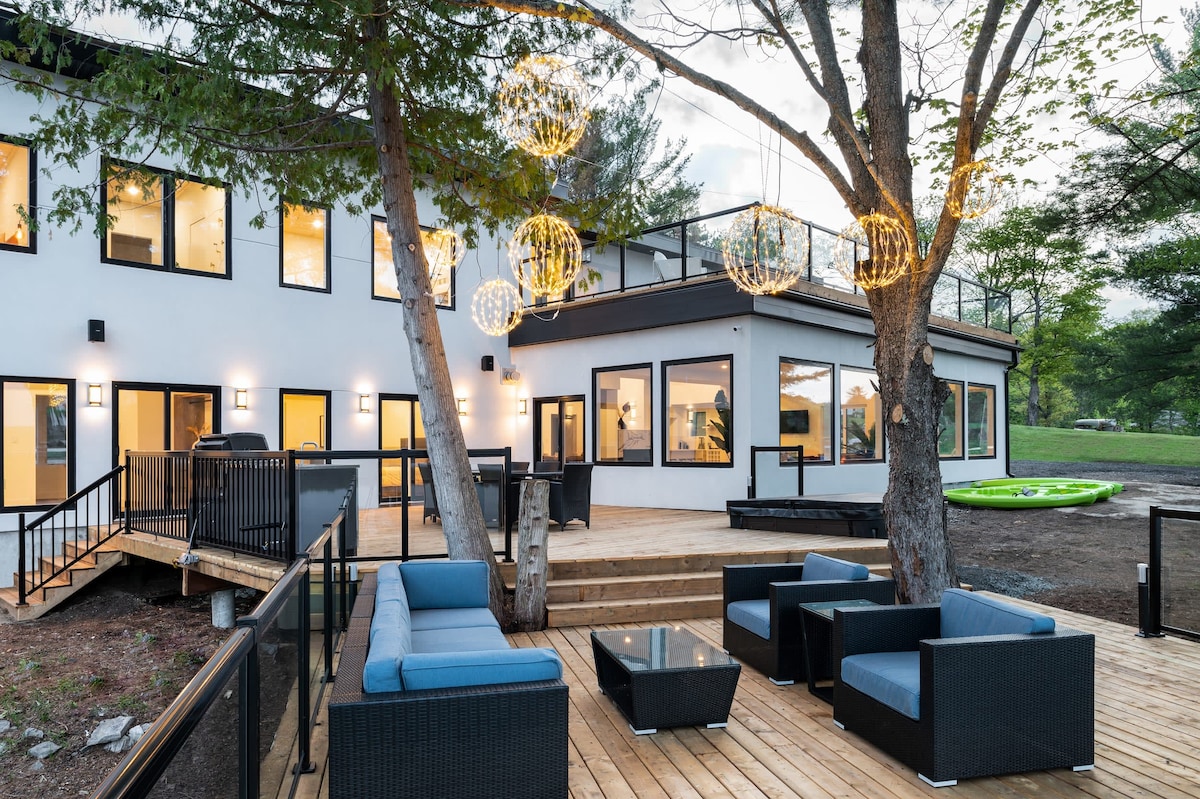Perched atop a hill, overlooking the Royal Laurentian golf course. 1h15 minutes journey from Montreal, and 20 minutes from Mont Tremblant ski resort. A game room stands ready, with a pool table, ping pong table, foosball, and a poker table. Access to a private jacuzzi as well as 2 outdoor dining areas and a fire pit (summer only) **Seasonal Access to a nearby lake and beach, a public pool, a bike/cross-country ski trail We can accommodate 18 guests at this property