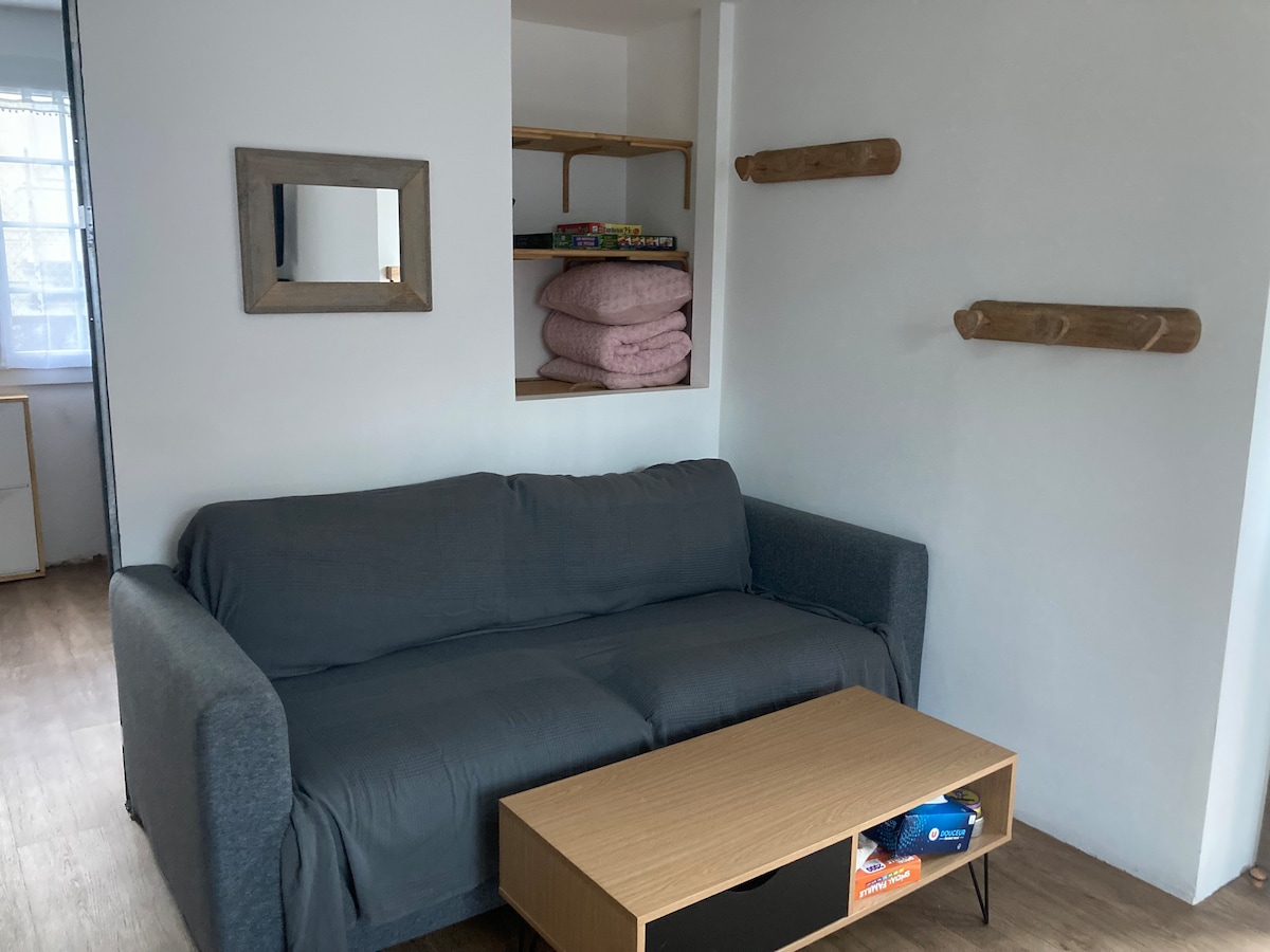 Downtown in a small pavilion on the ground floor located in a quiet garden, new studio of 27 m2. Di lantai dasar: dapur, kamar mandi lengkap, toilet independen, ruang tamu - makan, tempat tidur sofa, area tidur besar di lantai atas di loteng yang dilengkapi dengan akses dengan tangga penggiling yang bisa ditarik Tersedia penyimpanan ski sepeda. Serta area taman yang matang. 10 Euro menyangkut pasokan dan pemeliharaan seprai, kebersihan studio adalah tanggung jawab Anda.