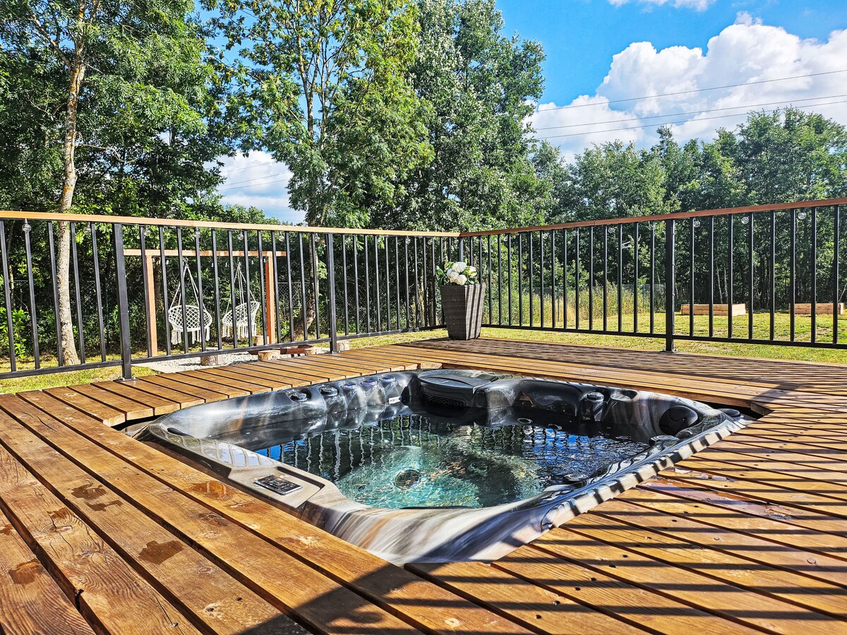 Rumah liburan kayu yang indah dengan kolam renang ini terpencil dan dikelilingi oleh alam dan halaman rumput.
