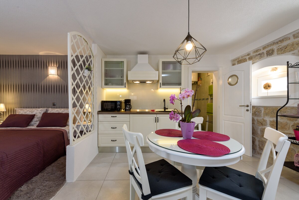 Studio unik dan menawan, berada di tengah - tengah kota tua Trogir. Dekat tepi laut Trogir, jalur perahu, perjalanan ke pulau, peluang wisata. Restoran/pizzeria keluarga kami menawarkan diskon 10% kepada tamu kami. Terletak di area yang aman, pintu masuk dipantau oleh kamera,kami tinggal dekat dan menjamin Anda menginap dengan aman. Kami bisa menyediakan parkir di tempat parkir Kota (dengan harga lebih murah). Jika Anda tertarik dengan sarapan, kirimkan pesan kepada kami. Terima kasih.