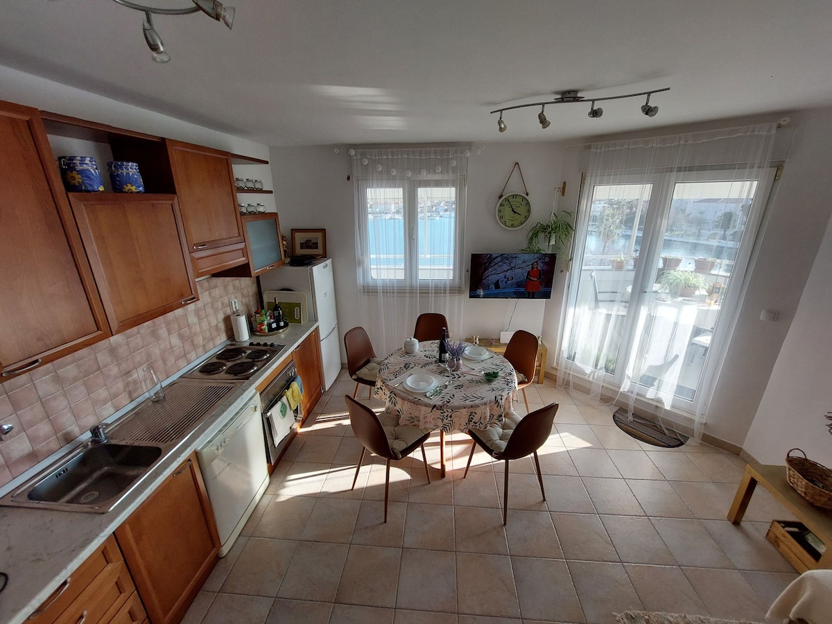 Kamar kecil ini berlokasi di lantai atas & menawarkan pemandangan indah di teluk Trogir. Anda bahkan bisa melihat Split di kejauhan, dengan gunung Mosor di belakangnya. Kamar ini cocok untuk 2 orang. Fitur lain kamar ini adalah: Dapur kecil, AC, 1 Kamar Mandi kecil dan Smart TV 43 inci dengan Netflix, dll. Anda bisa melihat langsung ke laut sambil berbaring di tempat tidur (180cm x 200cm). Balkon ini berukuran bagus. Ada meja dengan 2 kursi dan 1 kursi dek untuk berjemur.