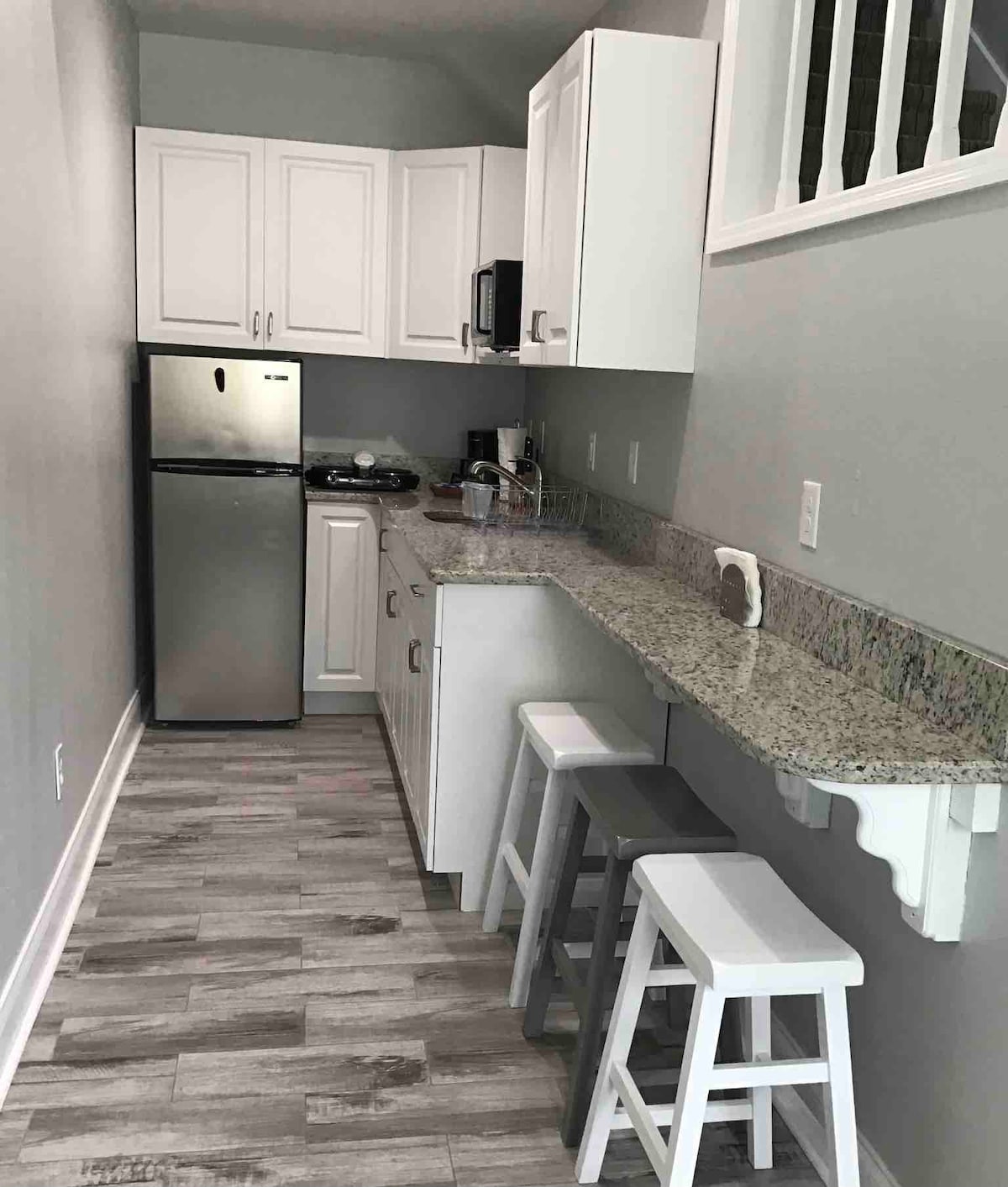 Tidak ada area bersama. Apartemen ini berada di area terpisah dari rumah dengan pintu masuk pribadi. Tempat ini memiliki 1 kamar tidur dengan tempat tidur berukuran queen, smart tv 55”, lemari pakaian, lemari, dan 2 nakas. Ruang kecil ini berisi smart tv 50”, wastafel, microwave, meja dan 2 kursi, cooktop, kulkas/freezer kecil, sofa berbentuk “L”. Kamar mandi memiliki wastafel double vanity, shower, bak mandi, lemari linen dan dispenser sabun mandi. Termasuk Wifi, Netflix, Amazon Prime, HBO Max. Tersedia kasur angin queen. Patio belakang pribadi.