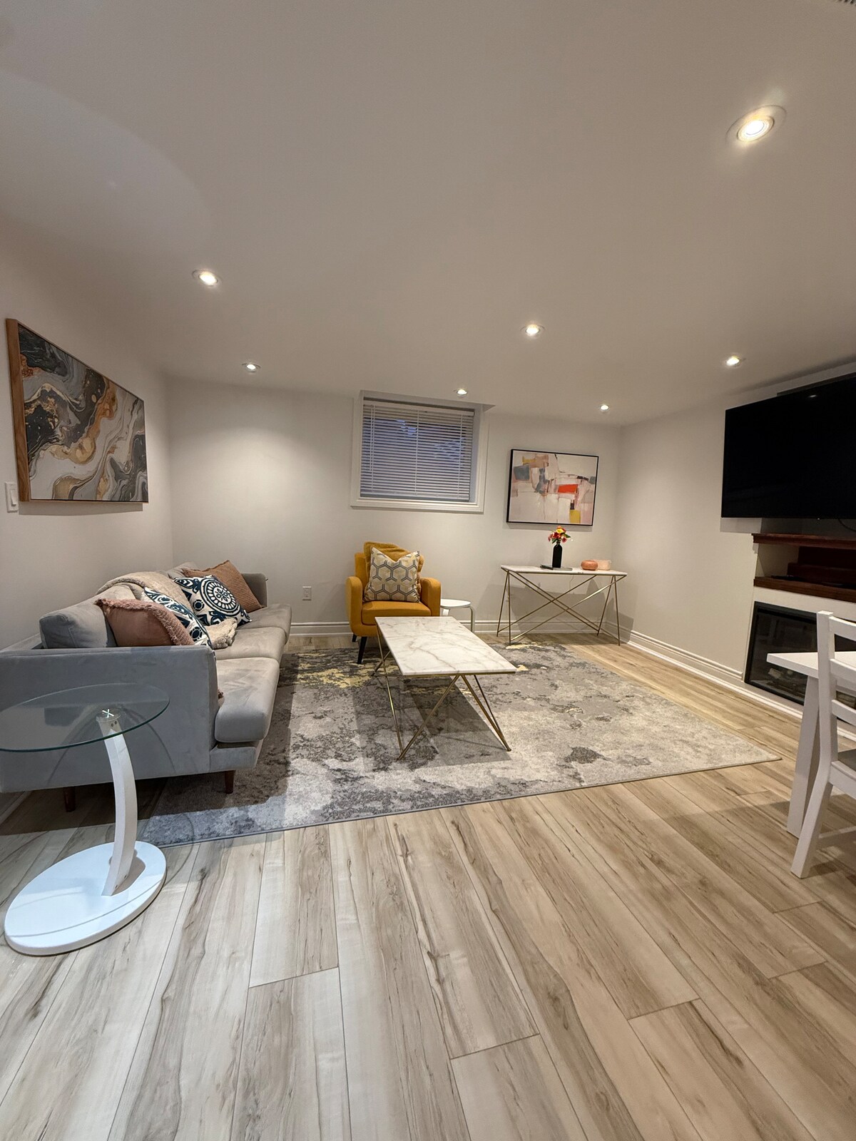 Welcome to your home away from home! This walkout basement has a private entrance and is newly constructed with a full bathroom and kitchen amenities, a spacious living room, indoor and outdoor dining areas, and a comfortable bedroom. Enjoy modern conveniences such as Wi-Fi and a 50" television with a fully paid Netflix subscription. Your convenience is our priority, with a designated parking space in the driveway for guests. Located nearby are popular dining options like Swiss Chalet, DQ, etc.