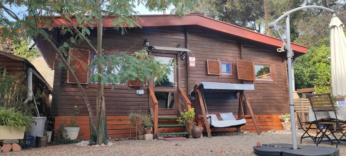 Es una casita de madera, el espacio es pequeño però tiene la cama de matrimonio con armario y mesa, continua con una mini cocina con todo equipado,un baño y,ducha,una terraza jardin con mesita y sIllas y ,vistas al mar. Està cerca pero independiente a la casa del anfitrión.