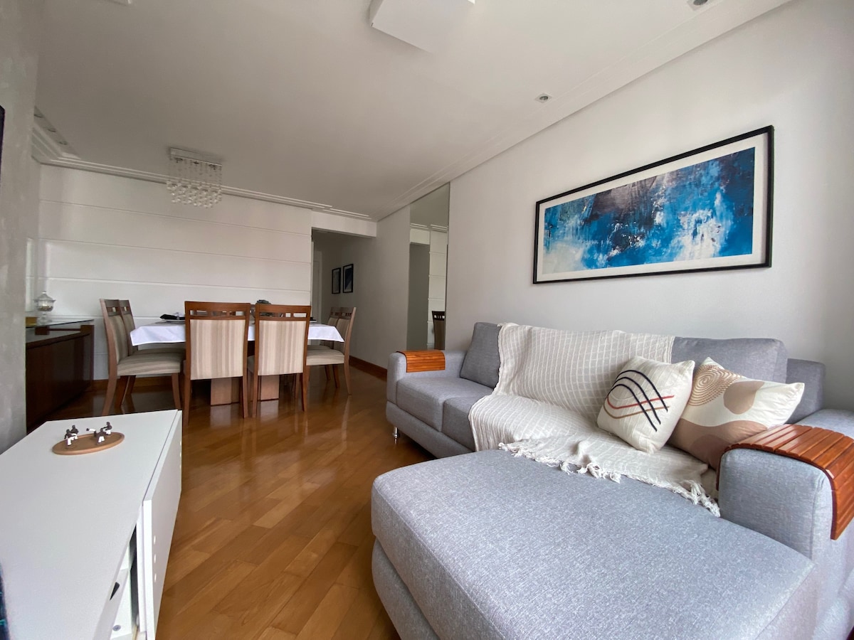 Apartemen lengkap 2 kamar tidur, 1 kamar mandi, ruang tamu dan dapur, handuk mandi dan seprai termasuk, dapur lengkap, Wi-Fi. Kunci pintu elektronik untuk kenyamanan lebih, pembuat kopi, kulkas, microwave, peminum air dingin atau alami, kipas angin langit - langit di semua kamar dengan remote control, TV di ruang tamu, TV ruang 65 inci untuk maraton, pasangan kamar tidur dengan lemari pakaian yang direncanakan, satu kamar dengan tempat tidur susun + kasur tambahan. Tempat ini bisa menampung hingga 5 orang.