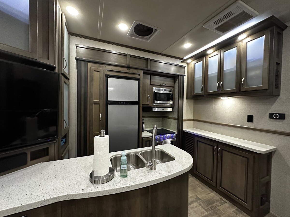 RV Glamping dua kamar tidur dengan persediaan lengkap/kereta golf.