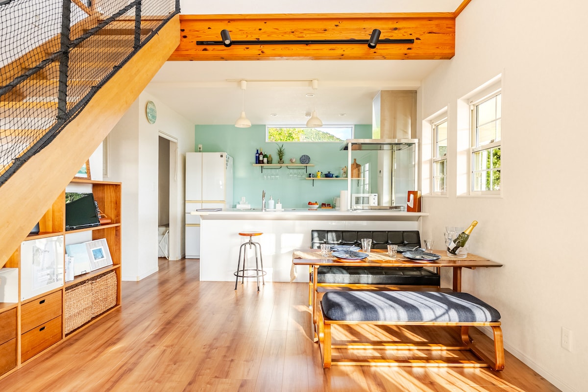 Surfers House terletak di udara pantai barat California di properti tsubo 330 yang luas. Dapur makan 1F di tangga adalah ruang terbuka dengan cahaya pagi. Di lantai 2, ada 2 kamar tidur dengan 7,5 tikar tatami, sehingga Anda bisa menghabiskan waktu bersama keluarga dan teman - teman, namun Anda bisa mengurus waktu pribadi Anda. Di taman halaman, anak - anak berlarian tanpa alas kaki dan orang dewasa menikmati secangkir kopi atau bir sambil merasakan angin yang menyegarkan dari perbukitan.Di malam hari, Anda bisa menikmati BBQ dan pengamatan astronomi di bawah bintang - bintang. Ada juga kursi bayi, piring anak - anak, ember popok, mainan anak - anak, dan banyak lagi. Ketenangan pikiran bahkan dengan anak - anak kecil♪ Di sinilah "kehidupan pulau" hanya untuk keluarga yang tidak bisa Anda temukan di hotel. Pantai Ashitok, yang dapat ditempuh dengan berjalan kaki, berada di pedalaman dengan ombak yang lembut, sehingga sangat cocok untuk anak - anak kecil bermain di laut. Berjalan - jalanlah di pagi hari atau senja untuk menikmati waktu bersantai seperti Amami. Sekitar 20 menit berkendara dari Bandara Amami.Ada juga banyak restoran, supermarket, dan tempat wisata dalam jarak 10 menit berkendara. Memasak bahan - bahan lokal di dapur besar akan menambah kenangan perjalanan Anda. Tamasya, workcation, liburan keluarga, teman, pasangan Kami dengan senang hati akan memberi Anda waktu pulau khusus untuk berpelukan dalam perjalanan ──apa pun.