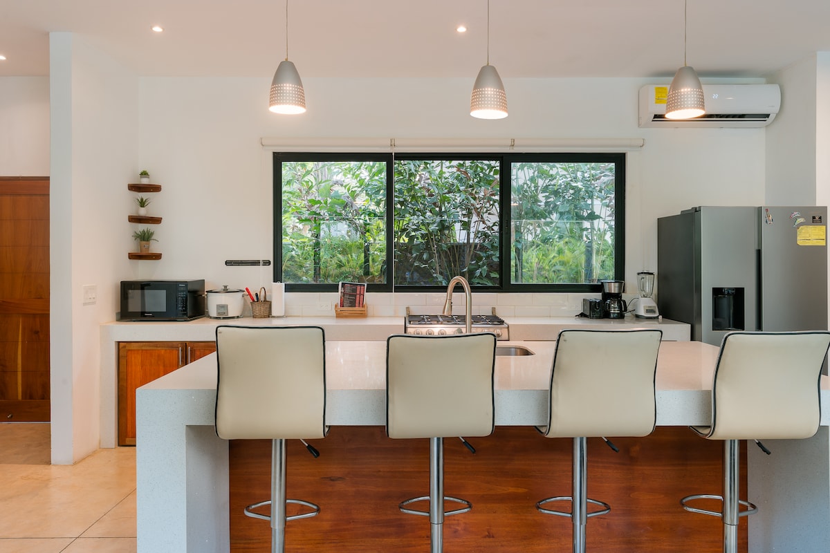 Tanah luas yang terletak di antara pohon buah - buahan, Ceibos, dan Guanacastes, tempat tinggal artistik kami mengundang Anda untuk bersantai dalam suasana yang tenang. Dihiasi dengan sentuhan buatan tangan, suaka ini memadukan keanggunan pedesaan dan kenyamanan modern. dengan satu kamar tidur utama dan satu kamar anak - anak, Rumah ini sangat ideal untuk keluarga dengan anak kecil karena jaraknya berjalan kaki ke Wild Child Play Garden, 10 menit berkendara ke pantai Guiones, 7 menit ke Pelada, dan 10 menit ke Ostional, tempat perlindungan peternakan penyu yang terkenal di dunia.