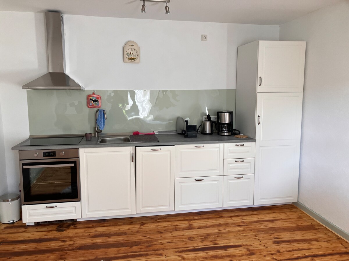 Ob mit dem Fahrrad den Vogelsberg erkunden, die schönsten Fachwerk Städte besuchen, die Natur im Vogelsberg genießen, oder nach einem Arbeitstag in der Gegend ausspannen-hier ist es möglich. Frisch renoviert und sehr hochwertig ausgestattet. Die Küchenschränke + Kühlschrank sind gefüllt, siehe Bilder. Sie müssen nicht unbedingt einkaufen gehen. Abrechnung des 'Verbrauchs' nach eigenem Ermessen, keine 'Minibar Konditionen'. Der Miele Waschtrockner erledigt kleine Wäsche (3kg) in einem Durchlauf