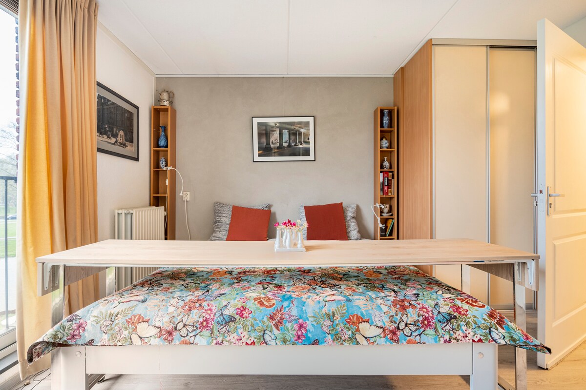 Kamar bergaya dan bersih di lantai 2, tidak ada lift di PINGGIRAN KOTA dengan pemandangan yang indah dan akses cepat ke pusat kota dengan metro 54. Kubah Arena, Afas & Ziggo berada dalam jarak berjalan kaki. AMC, Rai, University's & Airport sangat dekat. Sangat nyaman bagi mereka yang bepergian untuk bisnis atau belajar. Tempat ini bersih, aman, dan semua orang diterima, apa pun jenis kelamin, agama, atau kebangsaan yang Anda miliki. Dan semua Amsterdam telah membayar parkir. Maaf!