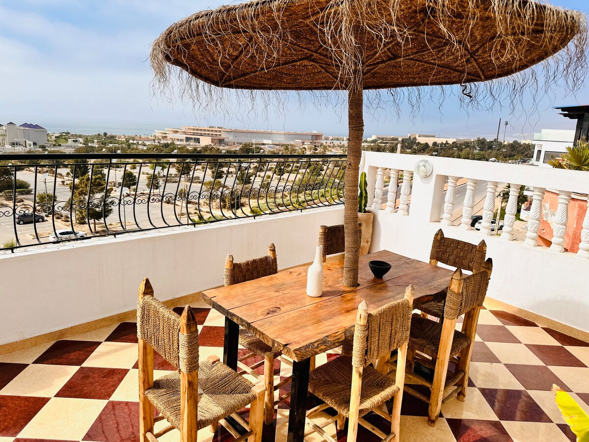 Apartemen dupleks kami, hanya 3 menit dari pantai, menawarkan 2 kamar tidur, 2 teras pribadi, dan semua fasilitas. Jarak berjalan kaki singkat ke toko, kafe, dan restoran, ditambah tempat berselancar seperti Devil's Rock dan Banana Beach. Baik Anda seorang profesional atau pemula, ombak yang konsisten dan pantai - pantai panjang Tamraght menjadikannya surga bagi para peselancar. Bersantai di teras Anda dengan pemandangan panorama Atlantik, percakapan larut malam dengan orang - orang terkasih, dan ciptakan kenangan abadi di surga selancar Maroko