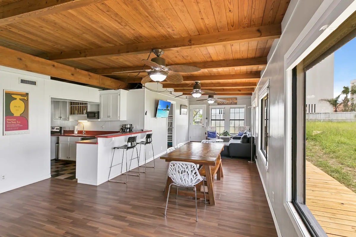 Permata tersembunyi di distrik hiburan dengan banyak restoran di dekatnya, akses pantai satu blok jauhnya, pemandangan indah kembang api dan matahari terbenam di Laguna Madre, dan SPI Migratory Bird Sanctuary tak jauh dari teras belakang. Temukan ketenangan di dekat air mancur yang menggelegak, dikelilingi bunga dan nyanyian burung penyanyi sambil bersantai di teras kami yang penuh warna tanpa tetangga dekat untuk mengganggu Anda. Menampilkan dekorasi eklektik dan tampilan industri dengan langit - langit terbuka dan perabotan kamar tidur buatan tangan.