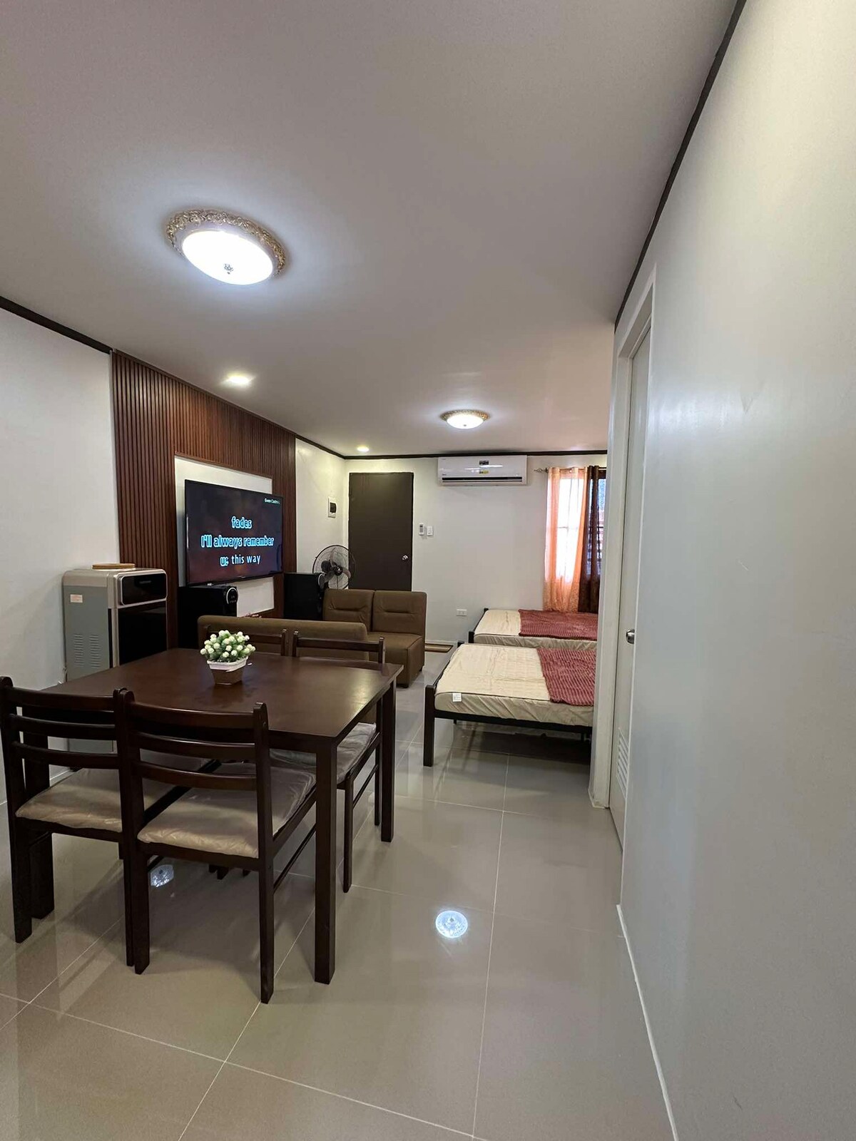 Apartemen tipe studio berperabot (34 meter persegi) ber - AC lengkap, dapur sendiri dengan kompor induksi, kulkas, oven microwave, pemanggang roti, peralatan memasak, pancuran air panas dan dingin dan sangat dekat (5 -6 menit naik mobil) ke Universitas Filipina Los Baños dan 4 -5 menit ke Institut Riset Nasi Internasional (IRRI) dan 3 -4 menit ke Institut Pembiakan Tanaman (IPB).