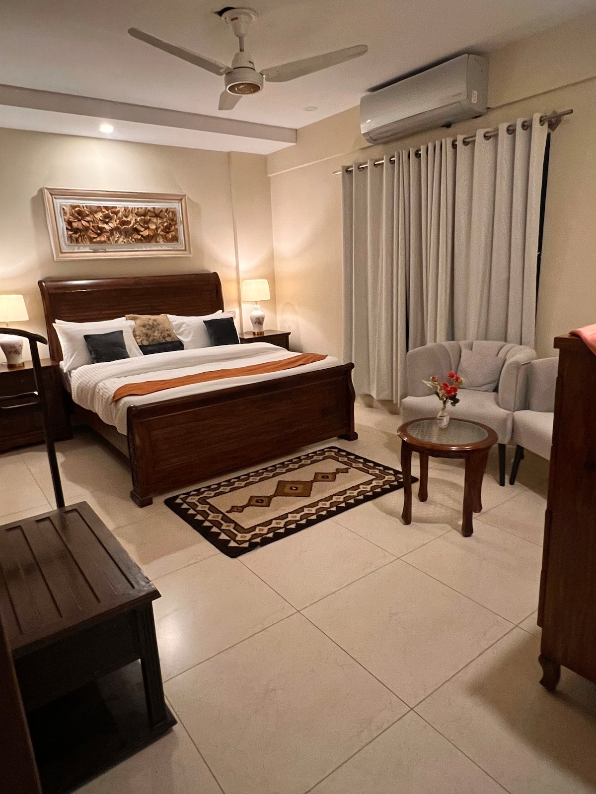 Masuklah ke dalam apartemen 3 kamar tidur Flamingo Grand, apartemen layanan paling canggih dan menarik secara estetika di Islamabad. Nikmati pengalaman yang aman, terlindung, dan bergaya di tempat yang berlokasi di pusat kota ini. Baik Anda berkunjung ke Islamabad untuk bersenang - senang maupun untuk bekerja, kami di flamingo yakinkan untuk memberikan Anda pengalaman bintang 5. Tamu juga menikmati tempat parkir khusus gratis dan aman, wifi gratis, dan pengalaman menonton serial tv favorit mereka di smart LED 65 inci.