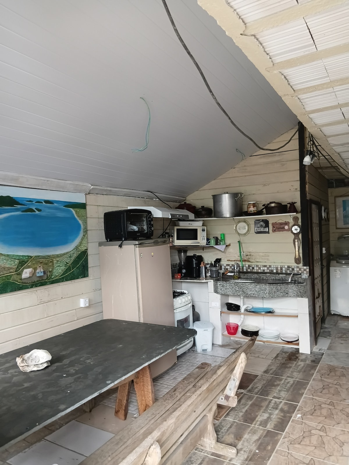 Rumah dengan 3 kamar tidur, 1 kamar mandi lengkap, ruang tamu, dan dapur lengkap. Balkon besar dengan ruang yang luas untuk barbeku bersama keluarga. Patio luar ruangan dengan kolam renang, taman, pancuran dan toilet. Ruang luar ruang ini digunakan bersama dengan 2 apartemen kecil. Mobil - mobil diparkir di depan rumah. Tempat ini memiliki ruang yang cukup luas Lokasinya 300 meter dari Praia do Meio, di Pinheira. Dan dekat dengan pantai-pantai indah lainnya, seperti Guarda do Embau dan Ponta do Papagaio.