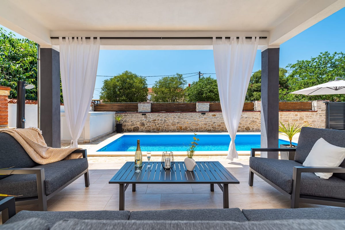 Welcome to Villa Poeta, a small villa with a heated pool, located in the tranquil village of Pridraga. This charming retreat accommodates up to 4 guests and offers a garden with a grill and dining area for delightful outdoor meals. Situated in a peaceful location, Villa Poeta provides a quiet escape while still being within reach of amenities. The nearest beach is just a short distance away, allowing you to enjoy the sun and sea.