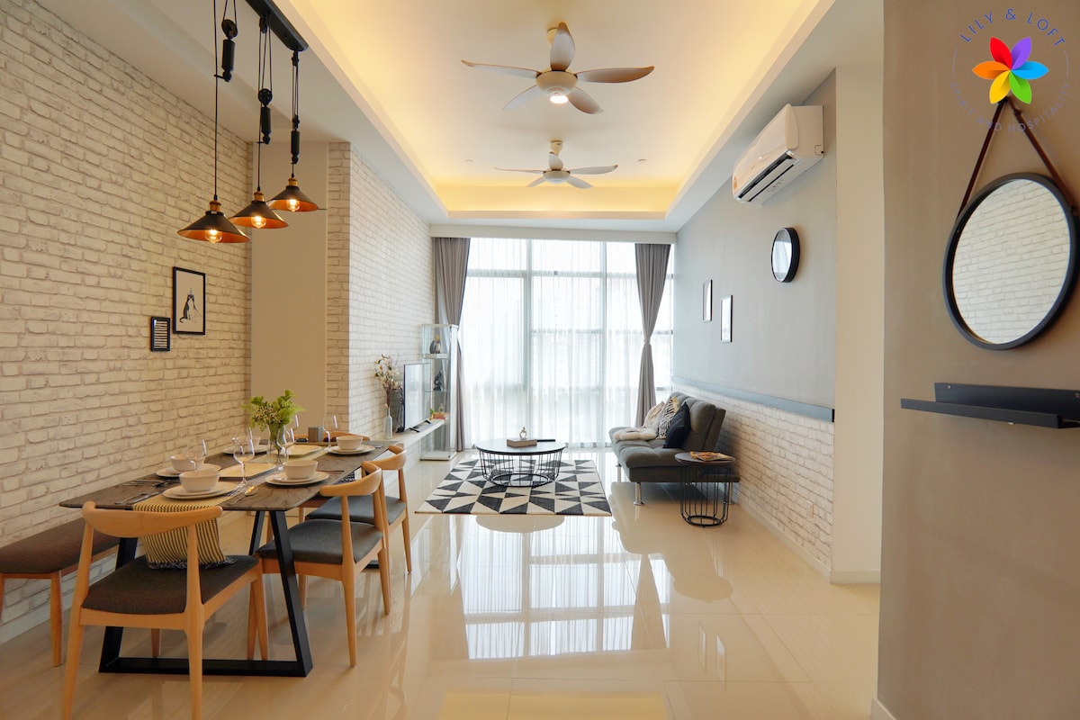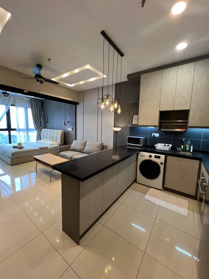 2 kamar tidur, 2 kamar mandi apartemen layanan mewah. unlimited 800mbps (Unifi) internet berkecepatan tinggi.43 inch smart tv di kamar tidur ensuite.55 inch smart tv di ruang tamu. Fasilitas dapur dengan kompor gas built - in, kulkas, microwave. Tangga pintu ke bioskop , outlet F&B, Lotus di mal paradigm. Akses mudah,Terletak di gedung yang sama dengan bar atap Le Meridien Hotel, pemandangan terbaik di kota ).24 jam keamanan 3 tingkat dengan kartu akses untuk memasuki gedung dengan tempat parkir pribadi