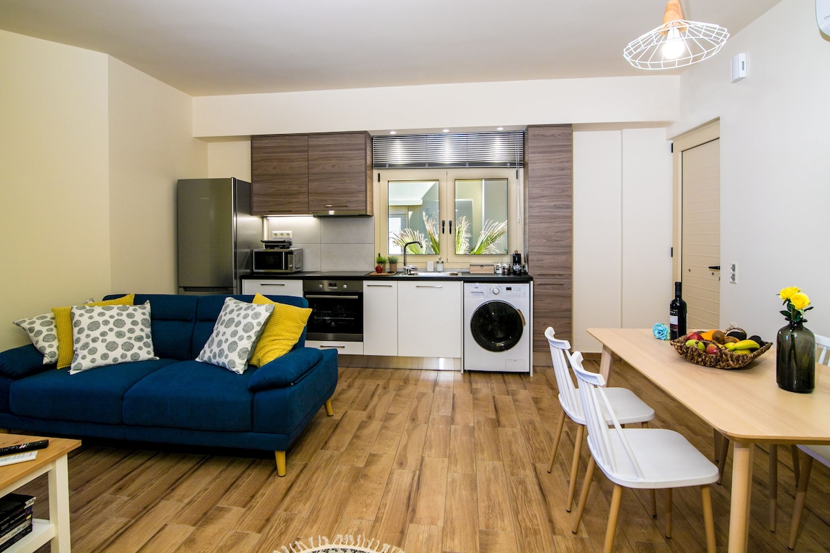 Ruang lantai dasar yang hangat, ramah, modern seluas 35 meter persegi, berfasilitas lengkap dan berperabot lengkap. Tempat ini memiliki 1 tempat tidur double, TV, kulkas, dapur, air panas 24 jam, AC, Wi-Fi, dan teras kecil di pintu masuk. Terletak di lingkungan yang tenang di Nea Alikarnassos dan sangat dekat dengan bandara (1,6km), pelabuhan (2,5km), pusat kota (2,7km), pantai (5,2km) dan persimpangan untuk akses ke jalan nasional (1km).