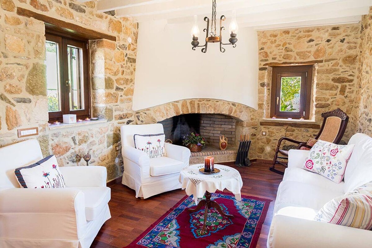 Terletak sempurna di ladang sebelah desa Myrsini, "Sotir Ali Stone House" adalah rumah pertanian batu yang dibangun indah yang bertengger di antara kebun zaitun, menghadap teluk Mirabello. Tempat ini dibangun di tempat yang sama persis dengan penginapan yang lebih tua, "magatze" seperti yang kami sebut di sini, yang melayani keluarga kami selama panen zaitun. Nama kebun zaitun di sekitar rumah adalah Sotirali dan mungkin merupakan korupsi nama Turki "Sotir Αli ".