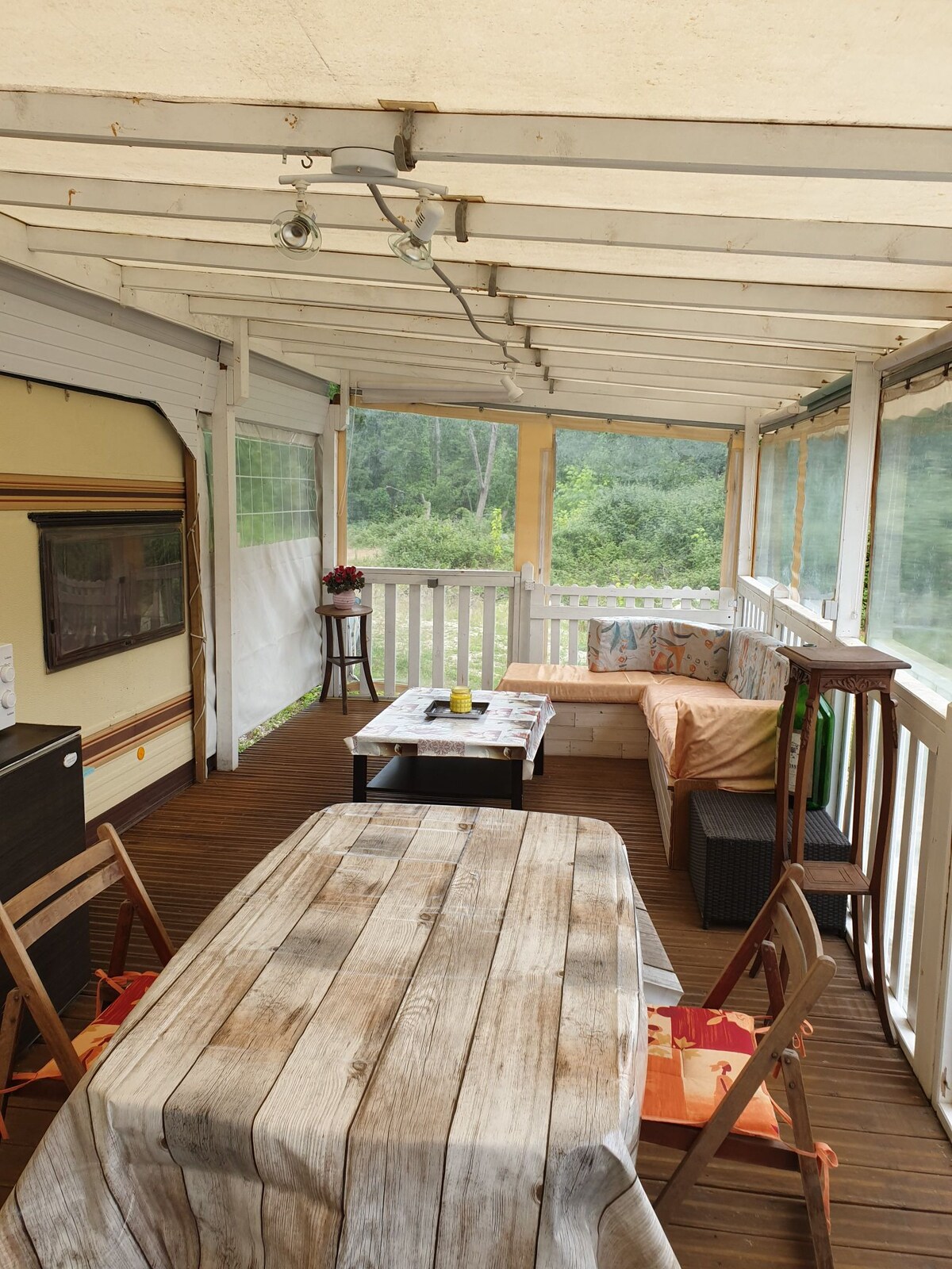 "Happy Camper" - liburan yang sedikit berbeda: Banyak kenyamanan di tempat kecil. BARU: teras tertutup yang luas! - Kamar tidur dengan tempat tidur double 1,40 x 2,00 (kasur empuk) dan pintu geser. - Dapur berperabot lengkap, - Area tamu memiliki sofa yang bisa dilipat (sebagai pengaturan tempat tidur 1,30 x 1,90 untuk setidaknya 1 orang tambahan) - Kamar mandi kecil dengan toilet "asli", tetapi shower dengan air panas berada di luar. - Wastafel tambahan berada di samping pancuran. Di karavan - dilarang merokok!