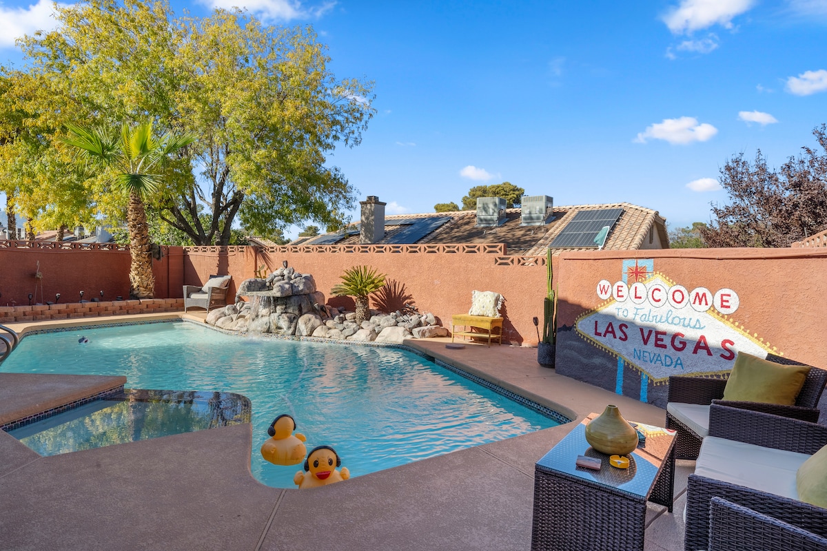Selamat datang di tempat peristirahatan Las Vegas Anda! Terletak hanya 9 mil dari Strip dan memiliki dua akses jalan bebas hambatan, rumah 3 kamar tidur ini menawarkan segala yang Anda butuhkan untuk liburan modern Anda. Baik jika Anda mencari petualangan di Strip, ini adalah tempat yang sempurna untuk Anda. Rumah kami bisa menjadi tempat persembunyian Anda saat jauh dari rumah. Habiskan waktu bersama orang-orang terkasih, bersantai di kolam renang, dan bersiaplah untuk bersenang-senang.