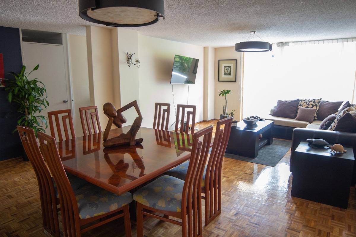 Apartemen yang terletak di lantai 15 dalam kompleks eksklusif di selatan Mexico City Lokasi strategis, akan mudah untuk merencanakan kunjungan Anda dan menikmati fasilitasnya: kolam renang, bioskop, kafetaria, barbekyu, jalur renang, ruang tunggu Inggris, pusat kebugaran, mini-supermarket, bowling, barbekyu, laundry, golf, lapangan sepak bola, bioskop langit, restoran, ruang bermain, ruang tunggu remaja, dll. Dekat Coyoacan, pusat perbelanjaan dan supermarket. Anda akan dengan mudah menuju lingkungan tinggal ini Roma, Condesa & Centro Kapasitas untuk 2 hingga 6 orang.